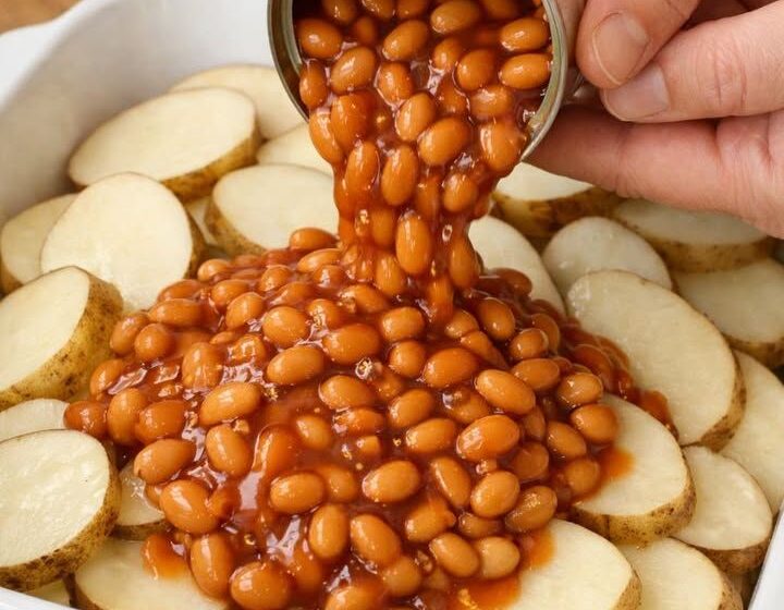Baked beans and potatoes belong together in the same way that a number of great pairings do — both starchy, both filling, both deeply satisfying on their own, and somehow even better when combined. This casserole takes the simplest possible approach to bringing them together: raw sliced russet potatoes layered in a greased ceramic baking dish, two cans of baked beans poured over the top, and a covering of sharp cheddar added in the final fifteen minutes of baking. The oven does the rest. The beans slowly seep between the potato slices during the covered bake, the potatoes cook through in the bean sauce, and by the time the foil comes off and the cheddar melts to a bubbling golden layer on top, the casserole has become something that tastes thoroughly cooked and carefully assembled despite requiring about ten minutes of active preparation.