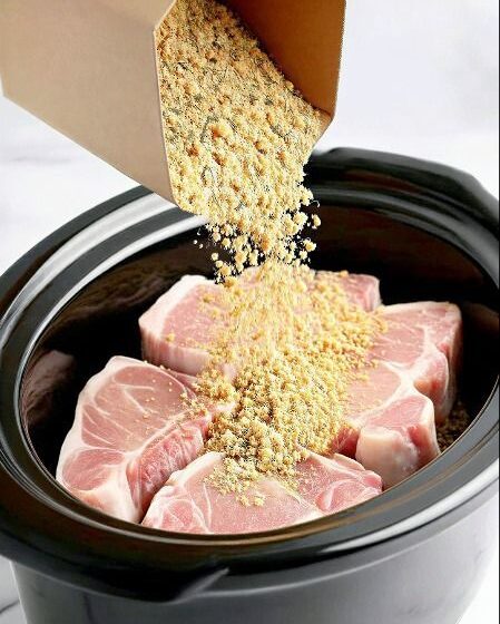 2. Place the pork chops in the slow cooker and pour the soup mixture over them.