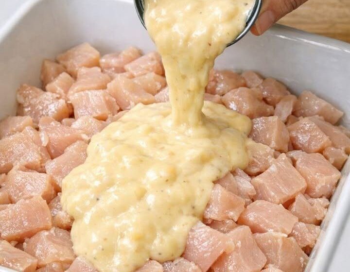 Pour the cream of chicken soup directly over the raw chicken in the baking dish. Use a spatula or the back of a spoon to gently spread the soup so it covers most of the chicken pieces.