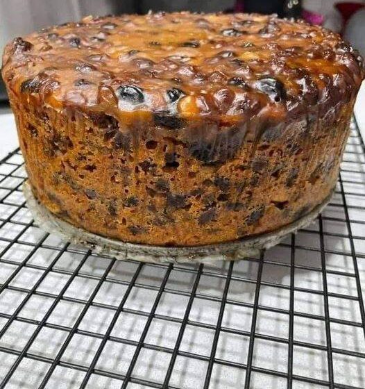 Allow the cake to cool in the tin for 10 minutes before transferring it to a wire rack. Dust with powdered sugar and garnish with cherries or nuts for a festive touch.