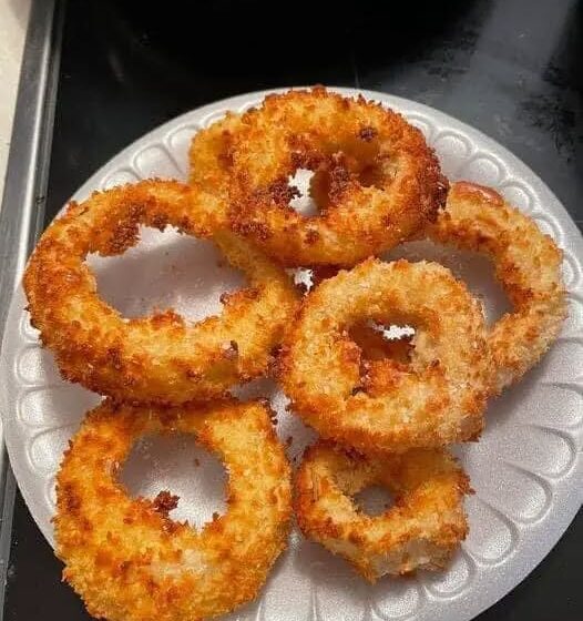 • Remove the cooked onion rings from the air fryer and transfer them to a serving plate. Serve hot with your favorite dipping sauce, such as ketchup, ranch, or aioli.