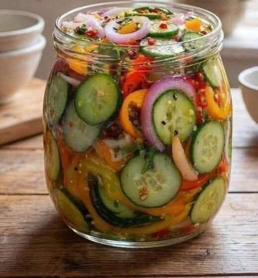 Place the sliced cucumbers, onions, and bell peppers in a large glass bowl or jar. Pour the pickling liquid over the vegetables, ensuring they are completely submerged. Let the vegetables marinate for at least 2 hours to overnight in the refrigerator.