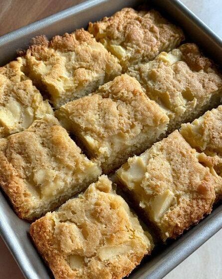 Let the cake cool completely in the pan before slicing, allowing the apple juices to settle for the best texture.