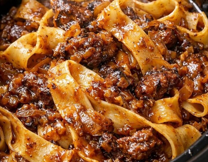 Combine pasta and sauce: Add the hot, drained ribbon pasta directly into the slow cooker with the beef and onion gravy. Use tongs to gently toss until every strand is coated and the sauce blankets the noodles. If the mixture seems too thick, splash in a little of the reserved pasta water, 1 to 2 tablespoons at a time, just until it looks silky and glistening.