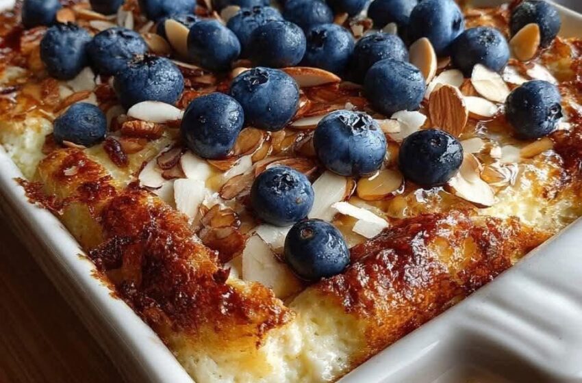 - Top with Blueberries and Almonds: Scatter fresh blueberries over the top of the casserole, and sprinkle sliced almonds evenly on top as well.