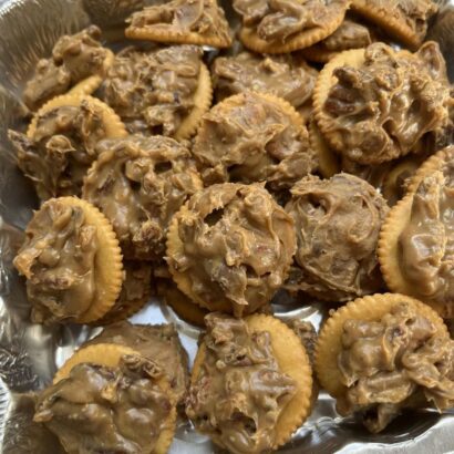 - Spoon the caramel-peanut mixture onto each cracker using a cookie scoop.