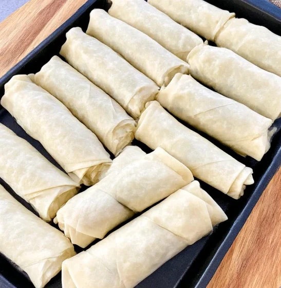 Lay a spring roll wrapper on a flat surface in a diamond shape. Spoon 2–3 tablespoons of filling near the bottom corner. Fold the bottom corner over the filling, fold in the sides tightly, and roll upward into a snug cylinder. Lightly moisten the top edge with water to seal. Repeat with remaining wrappers and filling.