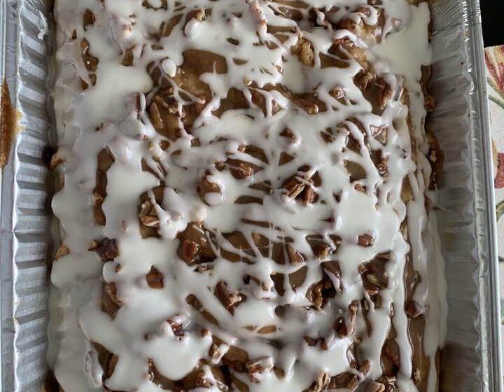This cinnamon roll cake brings all the flavors of classic cinnamon rolls into a simple, sliceable sheet cake. Baked in a single pan and finished with a rich vanilla glaze and crunchy pecans, it’s warm, comforting, and perfect for sharing.