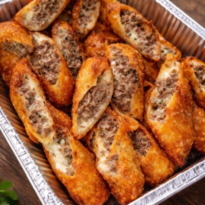They’re seasoned meat patties traditionally made with pork and beef, similar to a cross between a meatloaf patty and a hamburger.