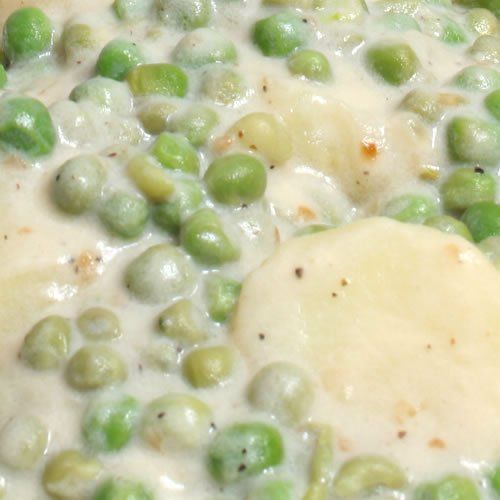 Gently fold in the cooked potatoes and peas, coating them evenly with the sauce.