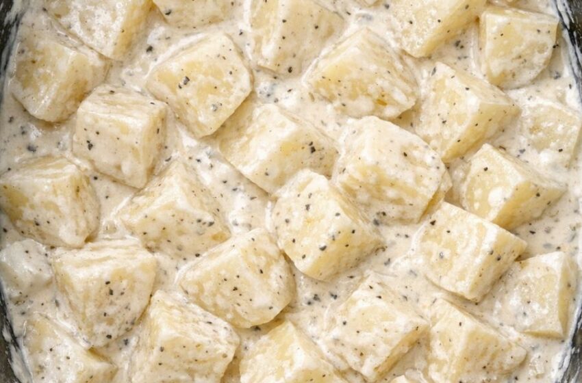 Cook: Cover the slow cooker with the lid and cook on LOW for 6–7 hours, or on HIGH for 3–4 hours, until the potatoes are very tender when pierced with a knife and the mixture is bubbly around the edges. The exact timing will vary slightly depending on how thinly the potatoes are sliced and your specific slow cooker.