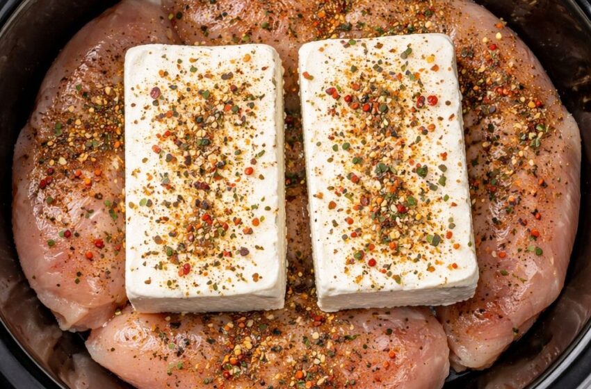Place the blocks of cream cheese directly on top of the chicken. If using the cream of chicken soup and melted butter, whisk them together in a small bowl first and pour the mixture over the cream cheese.