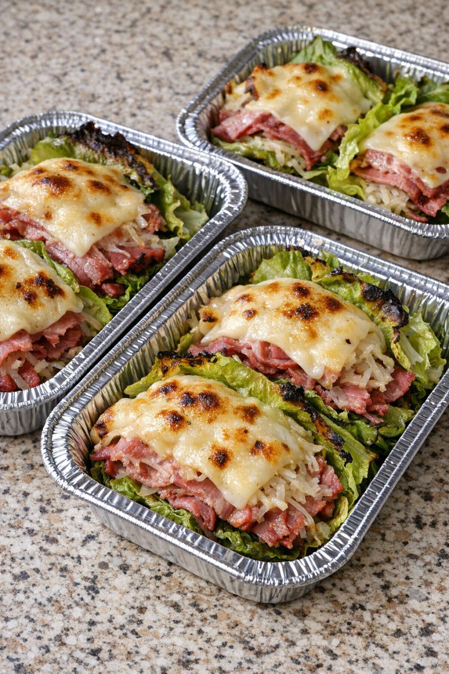 For a slightly richer, more old-school diner feel, add a thin smear of softened butter under the dressing on each lettuce leaf before filling; it mimics the flavor of buttered rye. If you miss the caraway notes from classic Reuben bread, sprinkle a pinch of caraway seeds over the sauerkraut before adding the cheese. You can swap the corned beef for thinly sliced pastrami or leftover roast beef if that’s what you have on hand, and turkey works nicely for a lighter, deli-style twist. For extra crunch, add a few shreds of raw cabbage or finely sliced green onion on top of the sauerkraut. If you prefer a more substantial wrap, double up the lettuce leaves for each one to make a thicker “shell” that can handle extra filling. These also adapt well to a stovetop: assemble the fillings on lettuce, then briefly melt the cheese under a covered skillet off the heat before folding. For make-ahead meal prep, keep the components separate—dressing, corned beef, drained sauerkraut, and washed lettuce—then assemble and bake in foil trays just before serving so the leaves stay crisp rather than soggy.