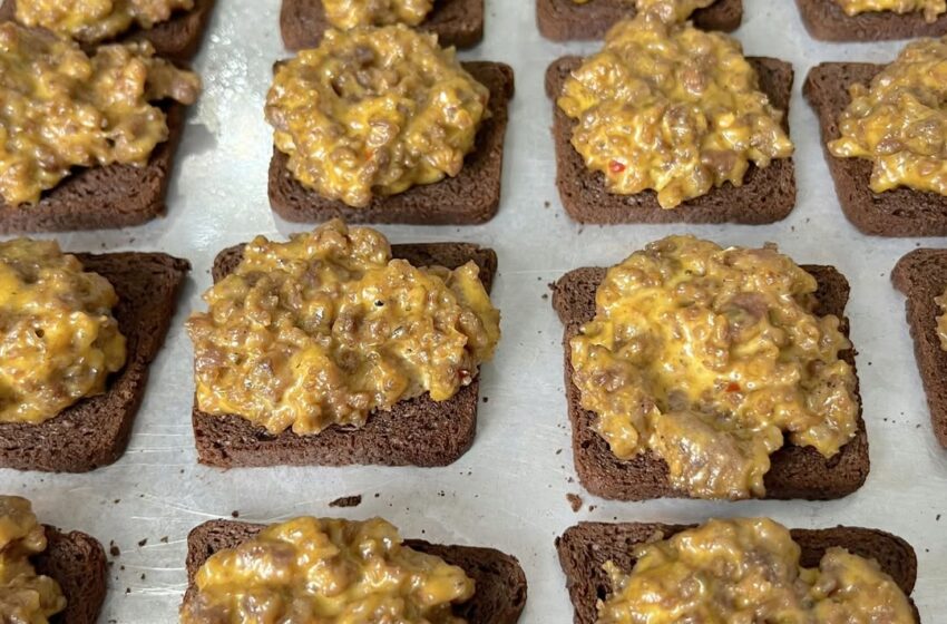 Spoon the hot mixture onto slices of cocktail rye bread or crackers.