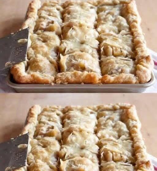 Preheat your oven to 375°F (190°C). Roll out one portion of dough on a floured surface to fit a 10×15-inch baking pan. Press it into the bottom and up the sides. Spread the apple filling evenly over the bottom crust.