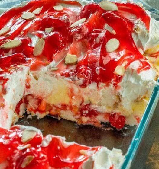 8. Finish with cherries and almonds: Drizzle remaining cherry pie filling over the top. Sprinkle with toasted almond slivers if desired.