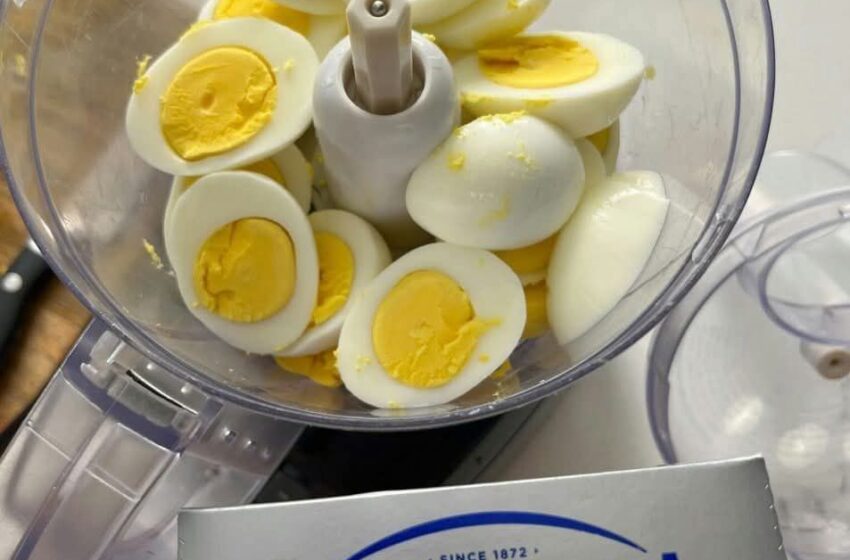 Add 6 whole hard-boiled eggs to a food processor. From the other 6, separate the yolks and toss them in with the others. Set aside the egg whites for later.