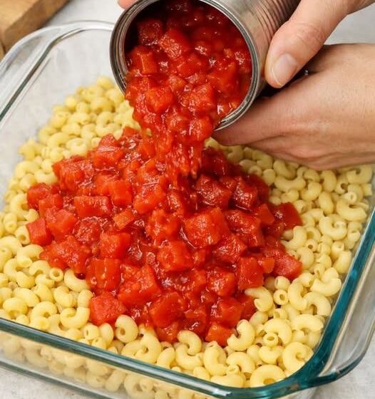 Layer raw elbow macaroni with canned diced tomatoes and two basic ingredients in a glass casserole dish for a cozy, crowd-pleasing dinner.