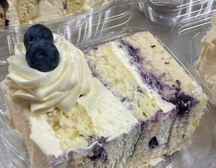 First, using a large serrated knife, trim the tops off the cake layers to create a flat surface. Place 1 layer on your cake stand. Evenly cover the top with cream cheese frosting. Top with 2nd layer, more frosting, then the third layer. Top with frosting and spread around the sides. The recipe doesn’t make a ton of frosting, just enough for a light frost. Top with blueberries or lemon garnish if desired. Refrigerate for at least 45 minutes before cutting or else the cake may fall apart as you cut.