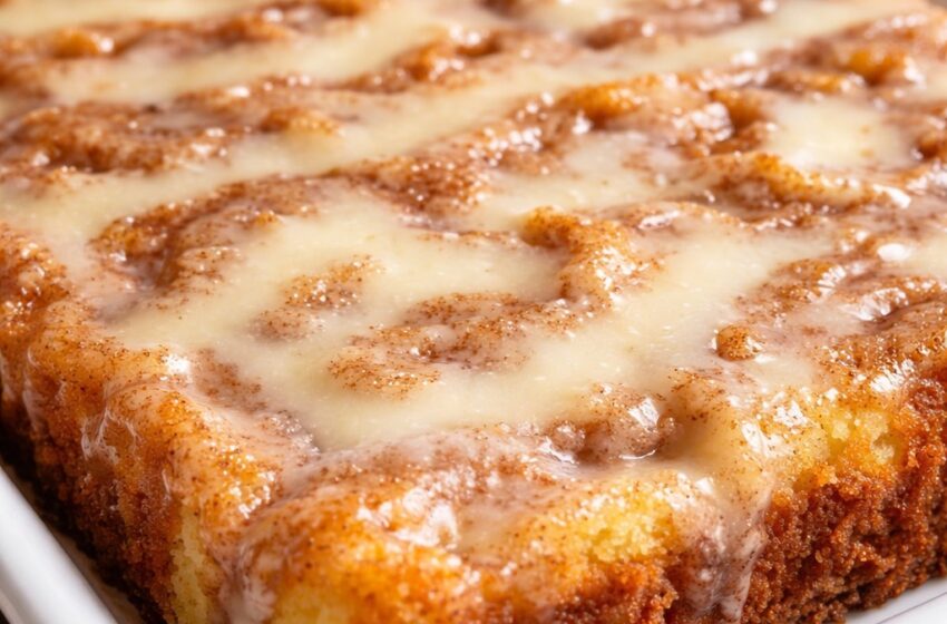 Drop spoonfuls of this cinnamon mixture over the cake batter. Using a butter knife, gently swirl the mixture through the batter to create a marbled effect. Don’t overmix—you want distinct swirls for that classic cinnamon roll look.