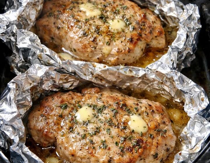 Carefully spoon about 2 tablespoons of chicken broth over each pork chop, letting it pool around the meat. This little bit of liquid, along with the melted butter, will create those rich, steamy juices inside the foil.