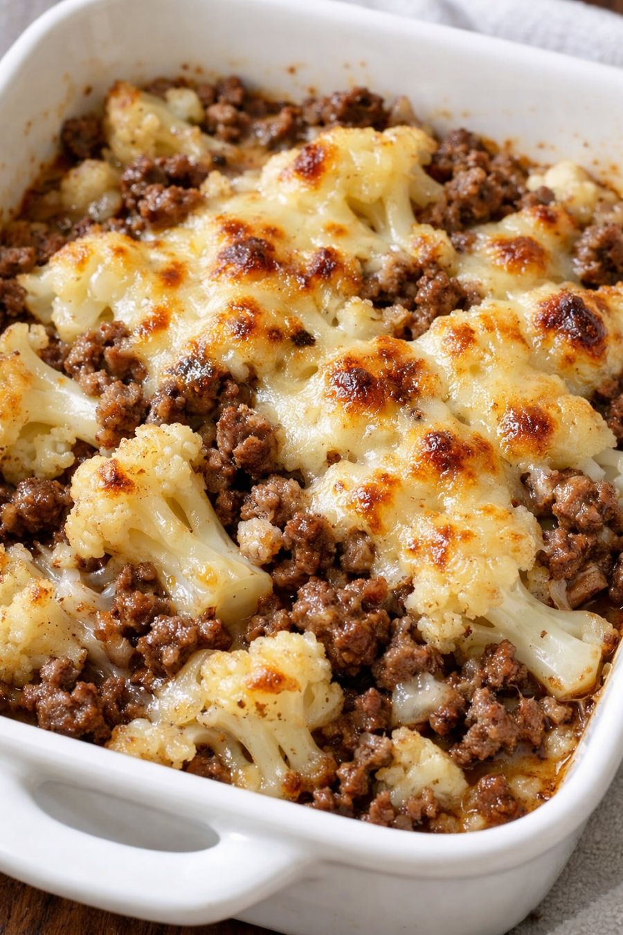 Let the skillet casserole rest for about 5–10 minutes before serving. This short rest helps the juices settle so each scoop is nicely saucy but not runny. Serve warm, scooping down through the browned cheese to get a mix of beef and cauliflower in every portion.