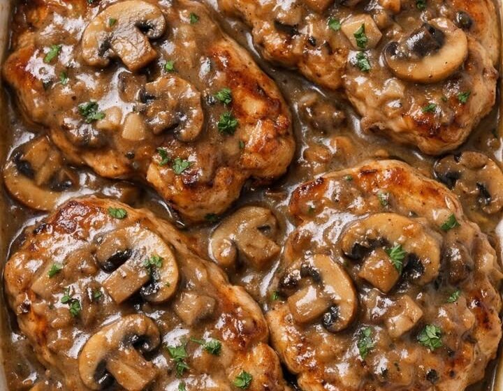 The pork chops bake slowly in a creamy mushroom sauce, allowing the flavors to blend beautifully while keeping the meat tender and juicy. As the sauce thickens in the oven, it creates a savory gravy that pairs perfectly with mashed potatoes, rice, or roasted vegetables.