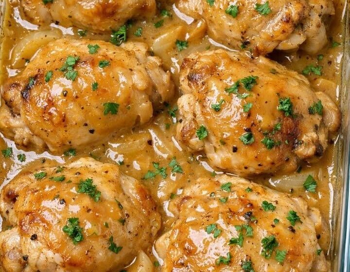 Where humble pantry staples transform into golden, gravy-kissed comfort—inspired by Amish kitchen wisdom that honors simplicity without sacrificing soul. Tender bone-in thighs bathe in a silky, herb-kissed gravy that clings to every forkful, all baked in one dish with zero fuss. No searing. No extra seasonings. Just pure, unpretentious nourishment that tastes like home.