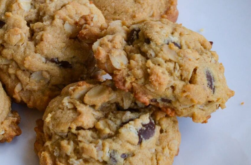 A delectable combination of creamy peanut butter, old-fashioned rolled oats, and semi-sweet chocolate chips in a cookie with a slightly crispy edge and a soft melt-in-your-mouth center.