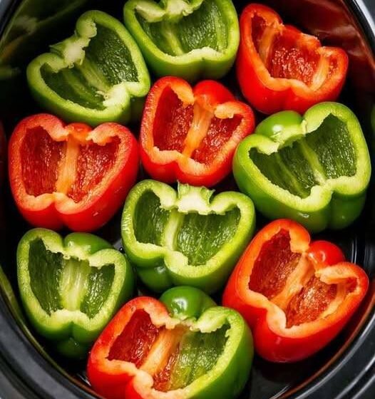 Arrange the halved bell peppers cut-side up in a 5–6 quart slow cooker, packing them in snugly so they stay upright during cooking.