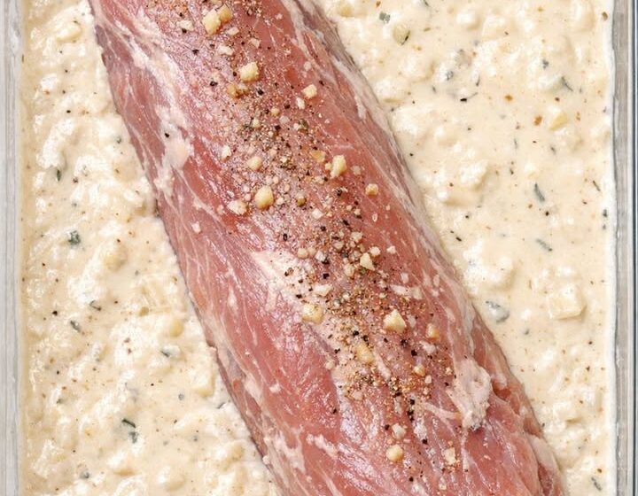 Pour the creamy sauce evenly over the pork tenderloin, making sure the top and sides are well coated. Use a spatula to spread it so the pork is surrounded by the sauce in the dish.