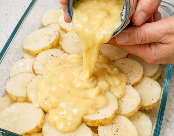 Pour the cream of chicken soup mixture evenly over the raw sliced potatoes in the glass casserole dish, making sure to cover as much of the surface as possible. Use the back of a spoon to gently nudge the sauce into the nooks between potato slices so everything gets coated.