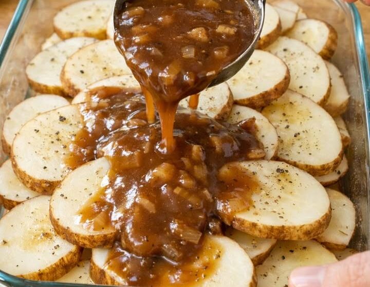 This is the kind of cozy, no-fuss supper I lean on when the day’s gotten away from me and I still want something that tastes like home. It comes straight out of the plain, practical cooking I grew up with in the rural Midwest, where Amish neighbors taught us that a few good ingredients, treated simply, can be enough. You just slice up raw russet potatoes, tuck in a little butter for richness, and pour savory beef gravy right over the top in a glass casserole dish. The oven does the rest, filling the house with that Sunday-dinner smell, even if it’s only a Tuesday night and you’re tired and in your house shoes.