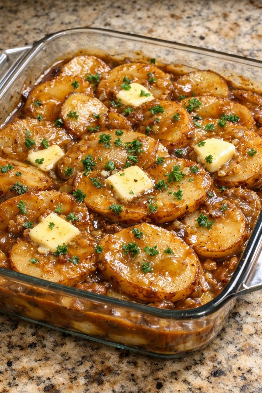 If you’d like a little more substance without changing the spirit of the dish, you can tuck a handful of very finely sliced onions between the potato layers before you pour on the gravy; it will give a gentle sweetness that reminds me of old church suppers. For a slightly lighter feel, use low-sodium beef broth-based gravy and cut the butter back to 2 tablespoons, though the full amount gives that classic Midwestern richness. You can also swap in Yukon Gold potatoes for a creamier texture, but russets are traditional and soak up the gravy beautifully. If your gravy is on the salty side, skip most of the added salt and let folks season at the table. To turn this into more of a main dish, scatter cooked ground beef or leftover roast beef shreds over the potatoes before pouring on the gravy. Leftovers reheat nicely in the oven, covered, at 325°F until warmed through; if they seem dry, splash in a spoonful or two of extra gravy or a bit of beef broth before reheating. For a touch of color, sprinkle chopped fresh parsley or snipped chives over the top just before serving, though in my kitchen it’s often served just as it is, straight from the glass dish to the table.