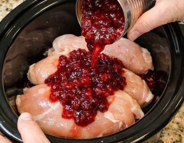 - The Pour: Pour the cranberry mixture evenly over the chicken, making sure every piece is well-coated.