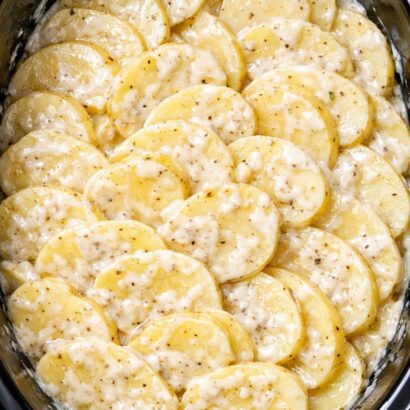 Layer in the slow cooker: Place the sliced onion and minced garlic in the bottom of a 5- to 6-quart slow cooker. Add the potato chunks on top. Scatter the butter pieces over the potatoes.