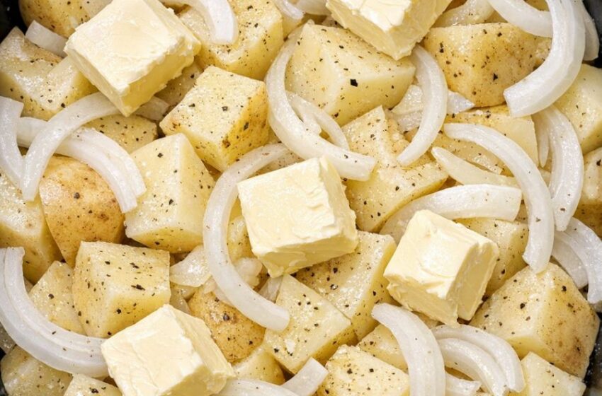 Layer in the slow cooker: Place the sliced onion and minced garlic in the bottom of a 5- to 6-quart slow cooker. Add the potato chunks on top. Scatter the butter pieces over the potatoes.