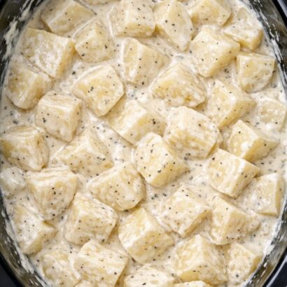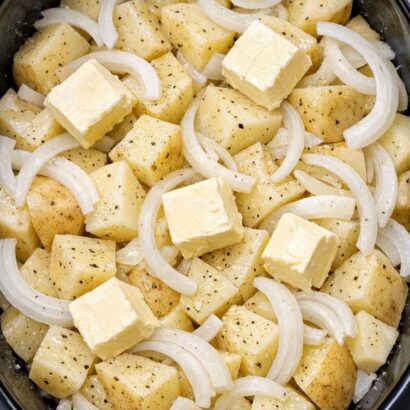 Layer the potatoes: Place a single, even layer of potato slices on the bottom of the slow cooker. It’s okay if they overlap slightly, but try to cover the surface.