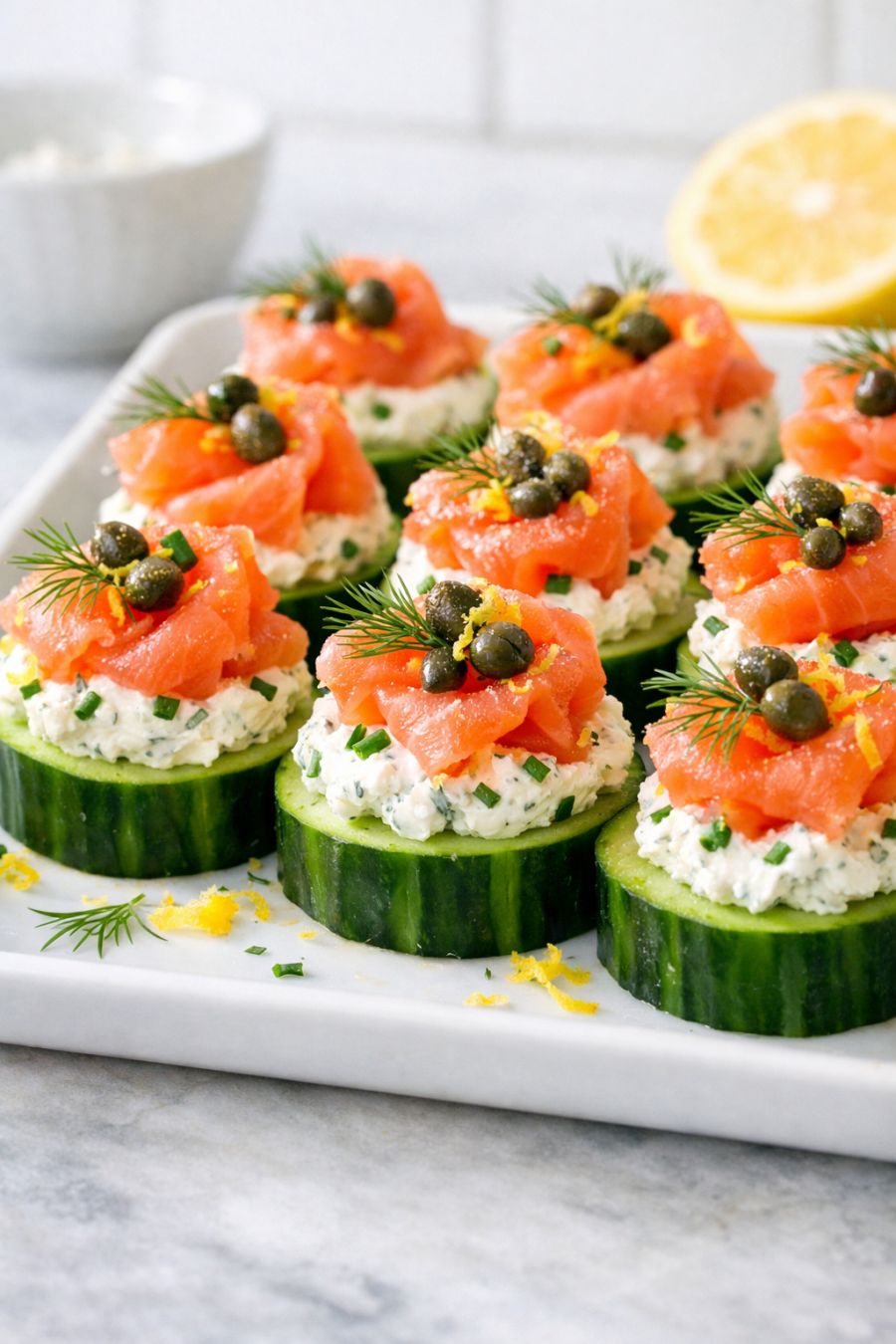 Top with smoked salmon: Take the sliced smoked salmon and cut or tear it into small strips or ribbons that fit comfortably on each cucumber round. Gently drape a piece of salmon over the herbed blend on each round, letting it fold or curl naturally for a bit of height and texture. You don’t need much—just enough to give each bite a clear salmon presence without overwhelming the herbs and lemon.