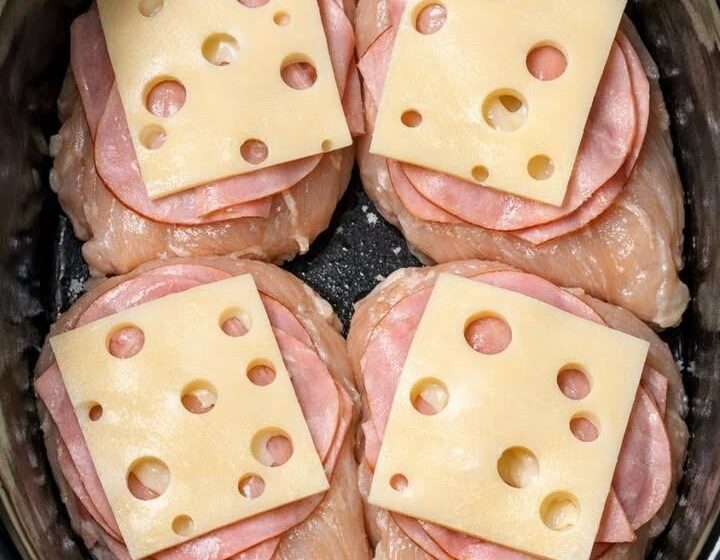 Place the Swiss cheese slices on top of the ham, overlapping them slightly so the chicken and ham are mostly covered. This mirrors the classic cordon bleu layers and will melt into the sauce.
