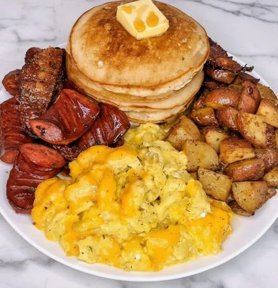 Rise and shine to the most magnificent breakfast spread! This brings together all your morning favorites—fluffy pancakes, creamy scrambled eggs, crispy roasted potatoes, and savory halal beef bacon and sausage—into one incredible meal. It’s the perfect way to make any weekend feel special, satisfying every craving with vibrant flavors and comforting textures.