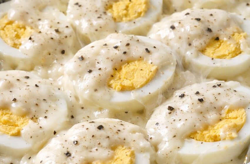 Pour the hot cream sauce evenly over the halved eggs in the tray, making sure every egg is well smothered. The sauce should pool slightly around them with a thick, glossy look.